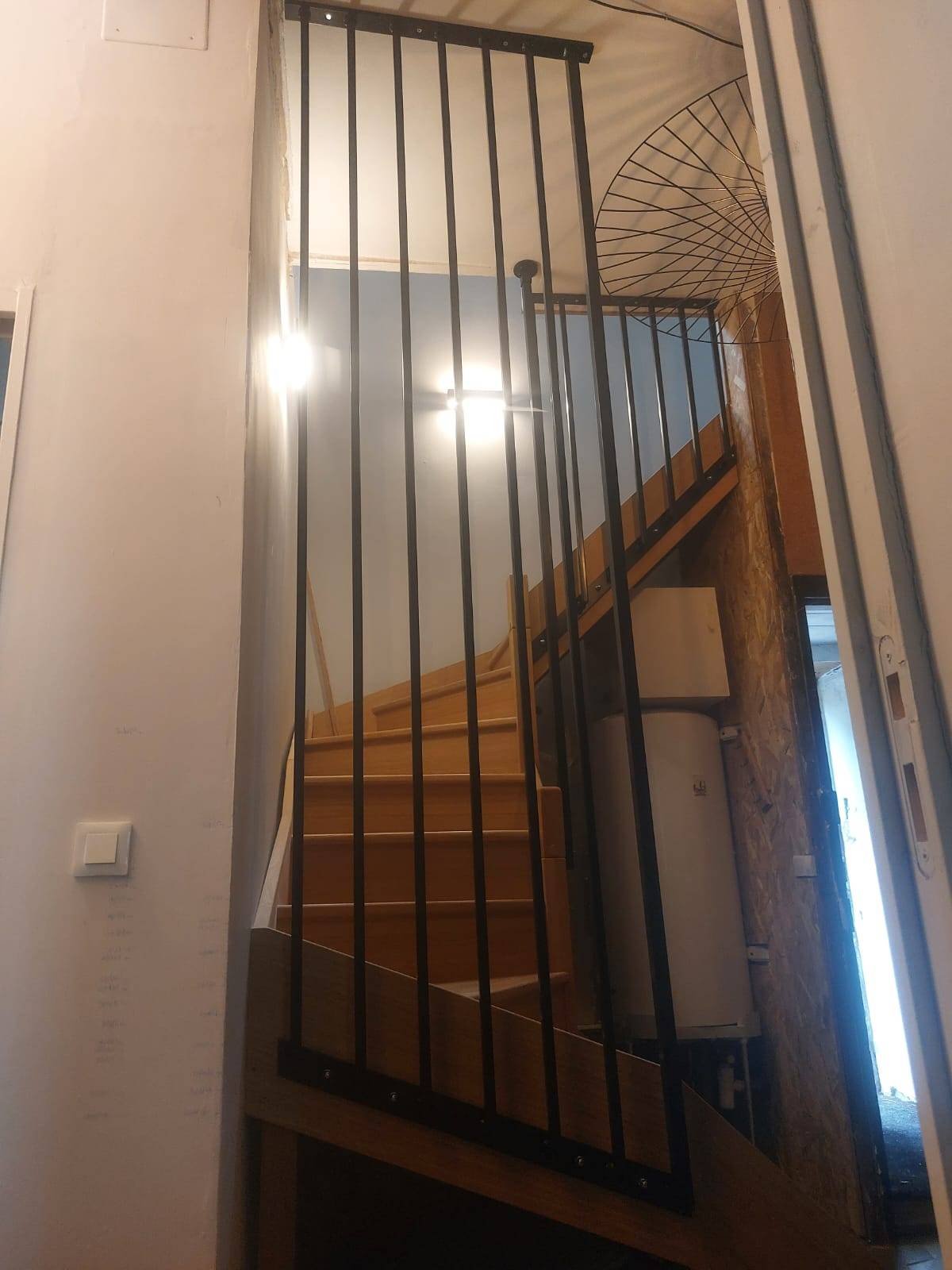 Il fait toute la hauteur de l’escalier, et les pièces ont été usinées pour un manchonnage et un vissage sur le haut. Design tout en étant minimaliste, il apporte une touche déco et tendance tout en s’intégrant parfaitement à son environnement.