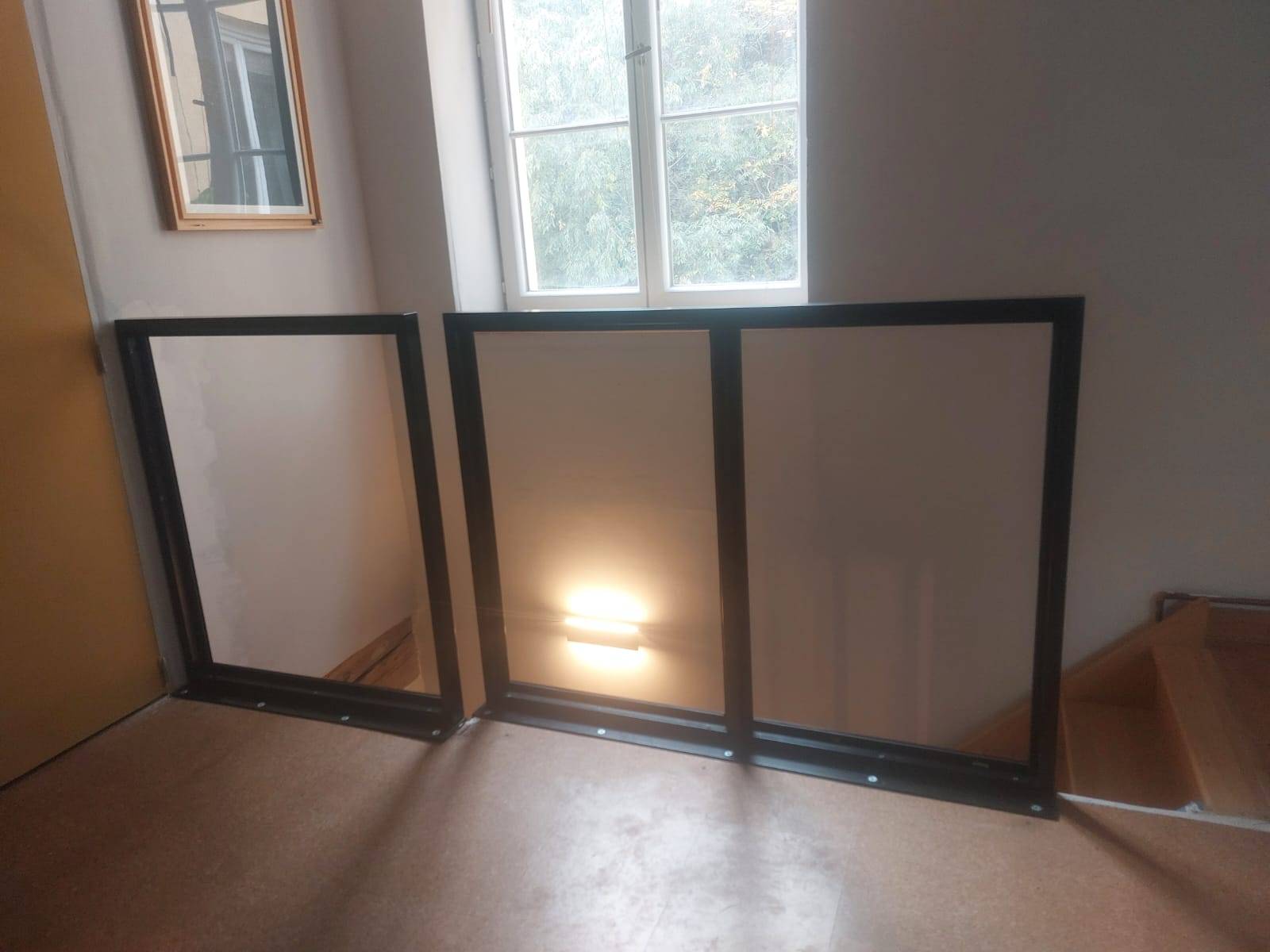 - A l’étage, ASMT DESIGN a fabriqué un garde-corps acier/verre, qui a été monté comme une fenêtre, et posé sur des dalles en bois : Il fallait commencer par déposer le garde-corps actuel et le remplacer par un garde-corps acier le plus minimaliste possible, selon la volonté de notre client. Il a été posé au niveau de la trémie.