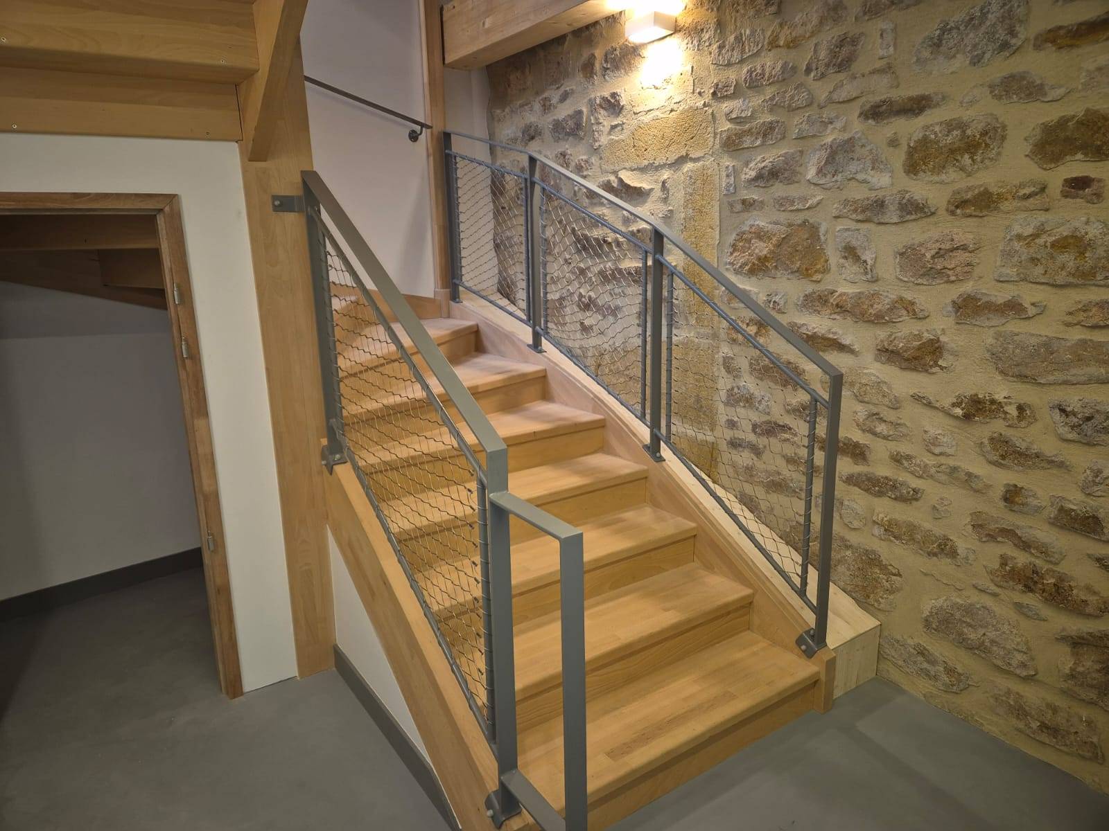 ASMT DESIGN a construit et posé les garde-corps de la cage d'escalier en profilés d'acier. L'ensemble comprend une lisse inférieure, une main courante et des poteaux en fer plat, ainsi qu'un remplissage en maille Inox (filets inox). Tous les éléments nécessaires, comme les fixations et manchons sont inclus, et la hauteur des garde-corps est réglementaire, fixée à 1 mètre des sols finis. L’ensemble apporte un effet moderne et complète précisément les matières comme le bois, la pierre utilisés dans cette rénovation.