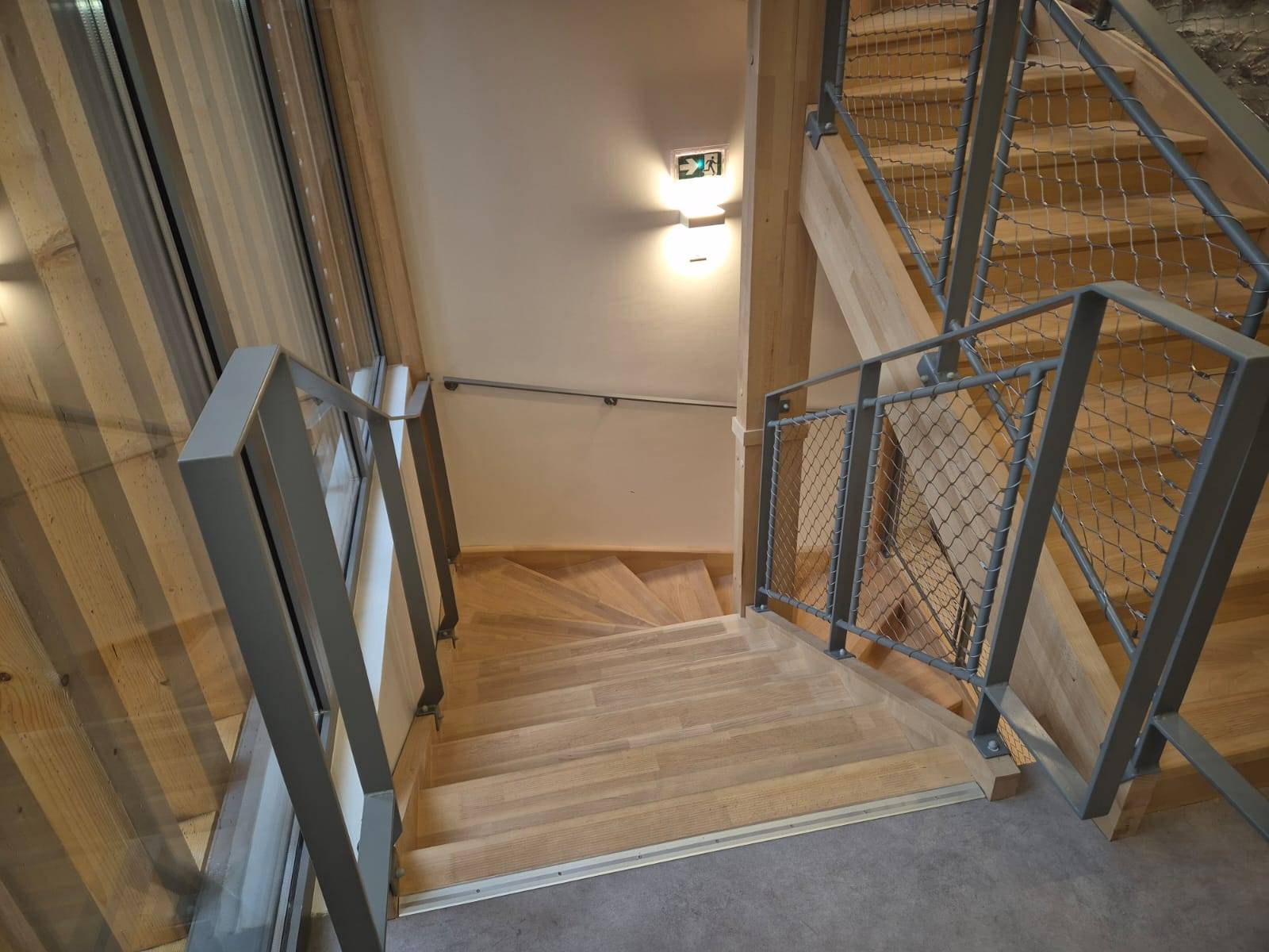 La mise en œuvre a été réalisée principalement par platine chevillée aux travers des limons bois de l’escalier.