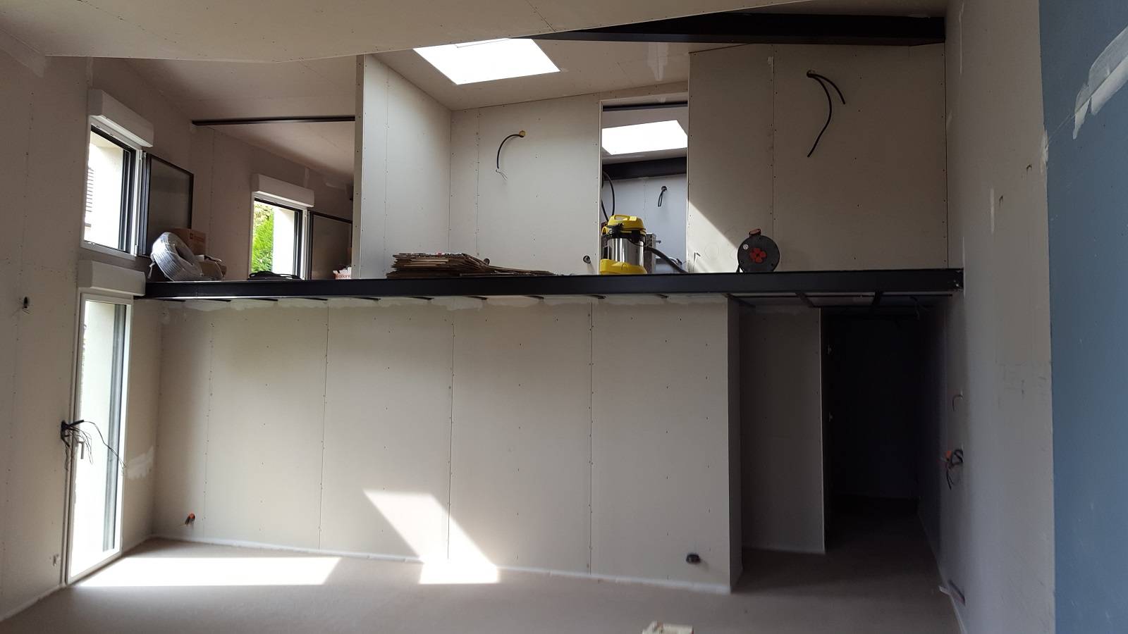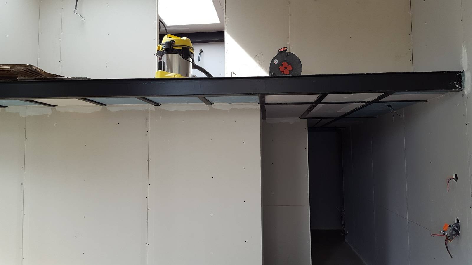 Les solives sont en acier tubulaire pour une fixation rapide du sol en OSB, et nous avons opté pour un déport d'une partie de la mezzanine au dessus du salon.
