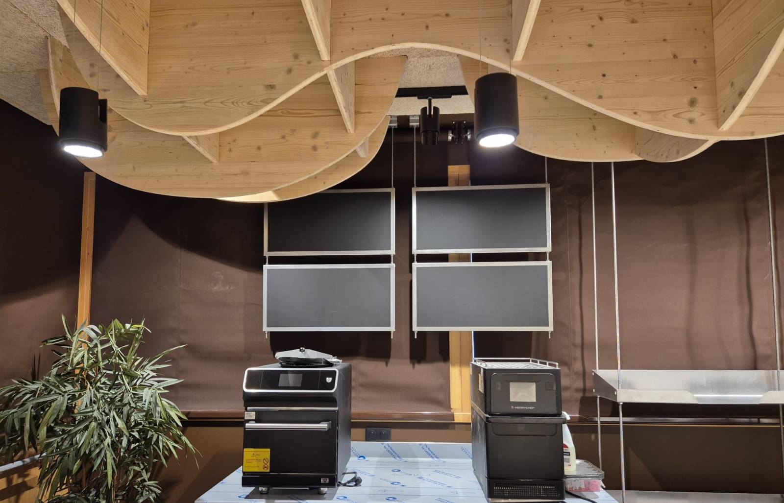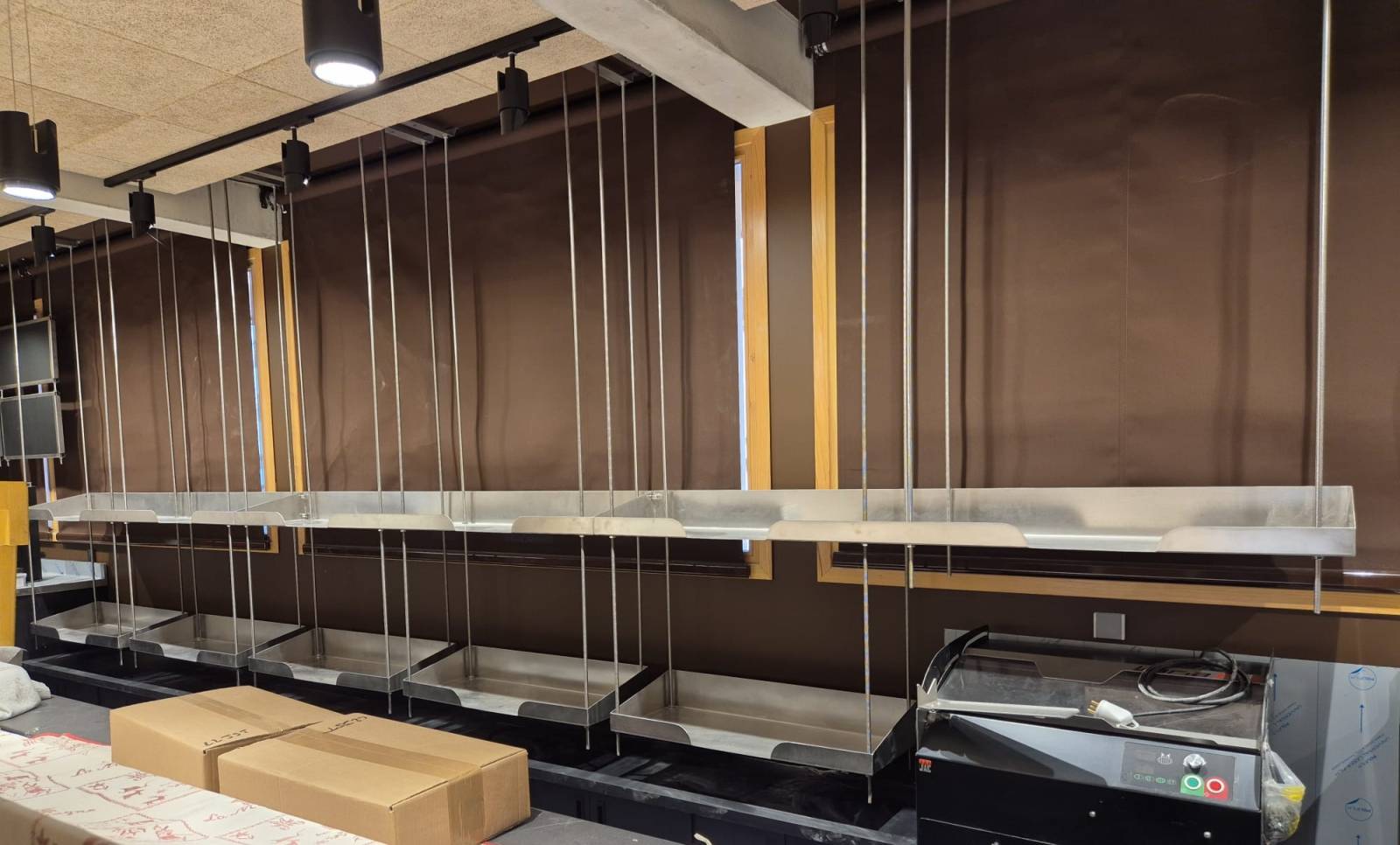 De même pour l'affichage traiteur et cafétéria, ASMTDESIGN a fabriqué des modules de rayonnage 1250 x 1250 x 400 mm, structure en tube acier 25 x 25 soudé.