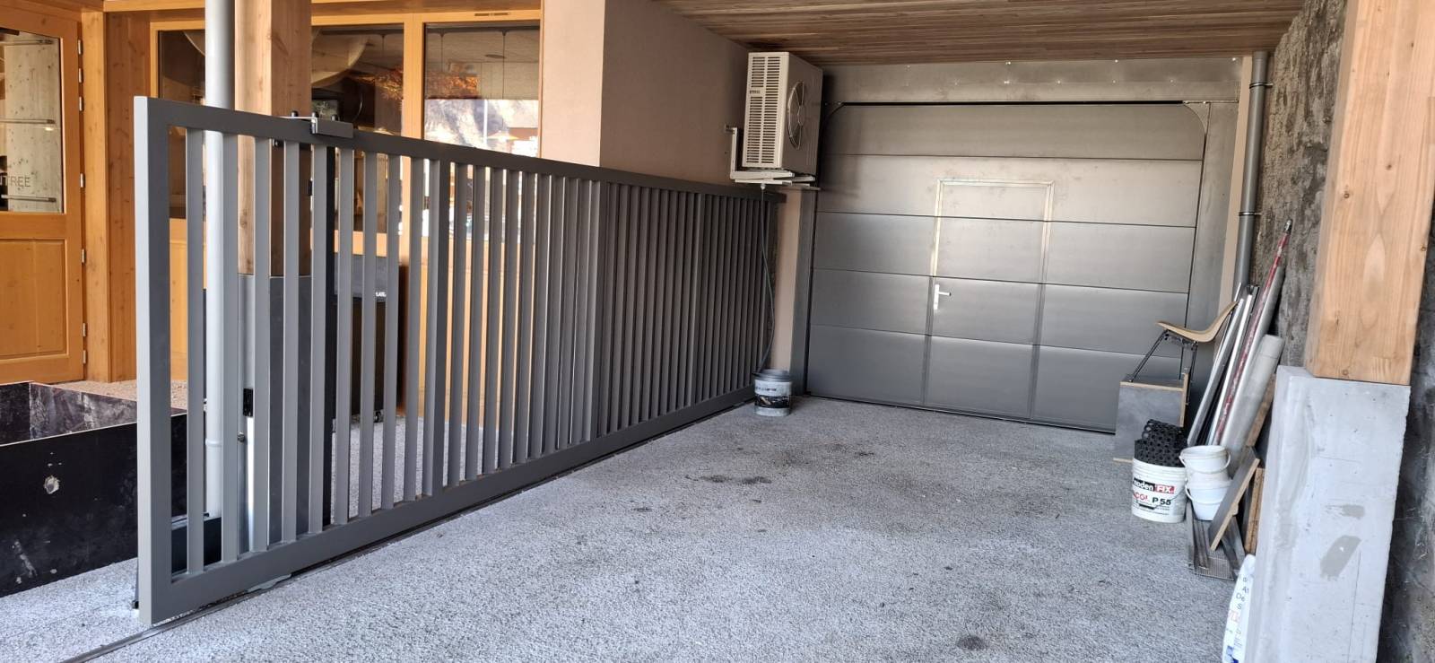 Le portail, fabriqué en acier galvanisé à chaud pour une protection optimale contre la corrosion, intègre un rail inox au sol, un système de guidage renforcé, ainsi qu’une motorisation 230V avec télécommandes, cellules de sécurité et éclairage LED d’avertissement.