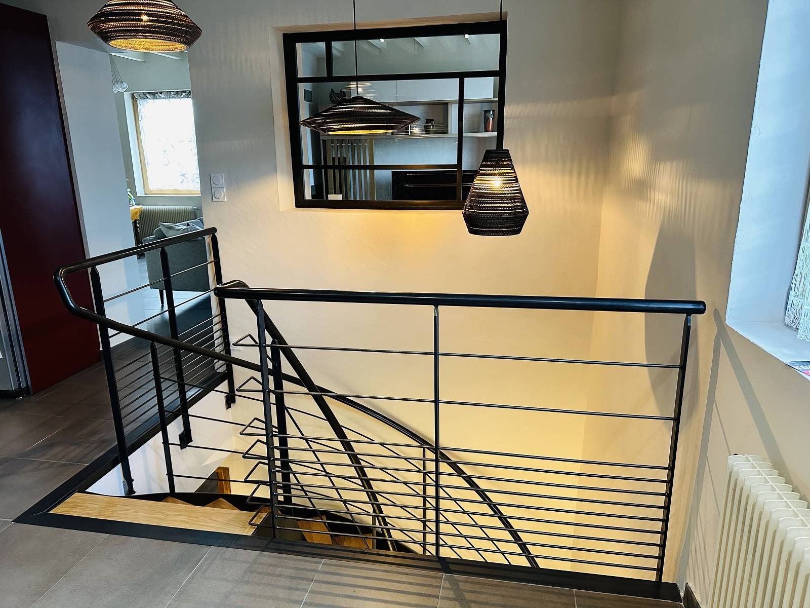 Pour compléter de façon harmonieuse l’étage, nous avons en outre fabriqué une verrière avec 5 pans de verre feuilleté. Cette dernière a été thermolaquée avec une peinture noire pour obtenir une concordance avec l’escalier.