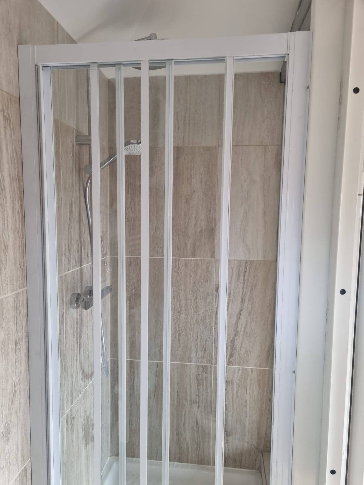 ASMT Design a fabriqué et posé une cloison pour la douche en acier et verre opale de 2.2mx0.9m environ, ainsi qu’un renfort pour la porte coulissante.