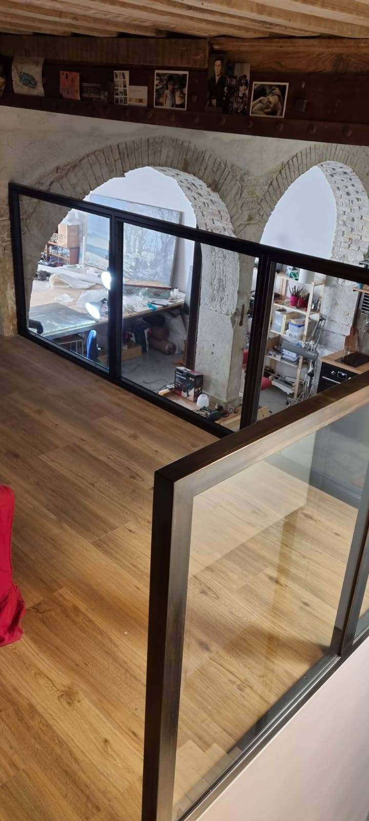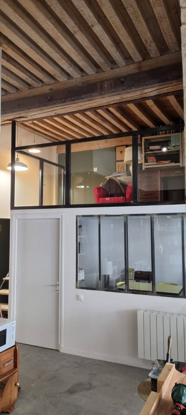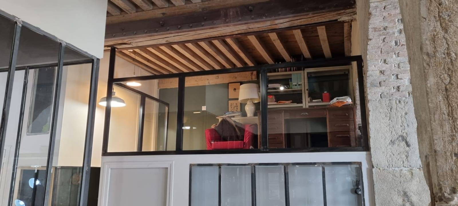 Directement inspiré des lofts, le résultat est vraiment réussi; le verre permet de laisser passer la lumière sans cloisonner les espaces, et donne à cet atelier un cachet authentique, en adéquation parfaite avec ce quartier de la Croix Rousse!