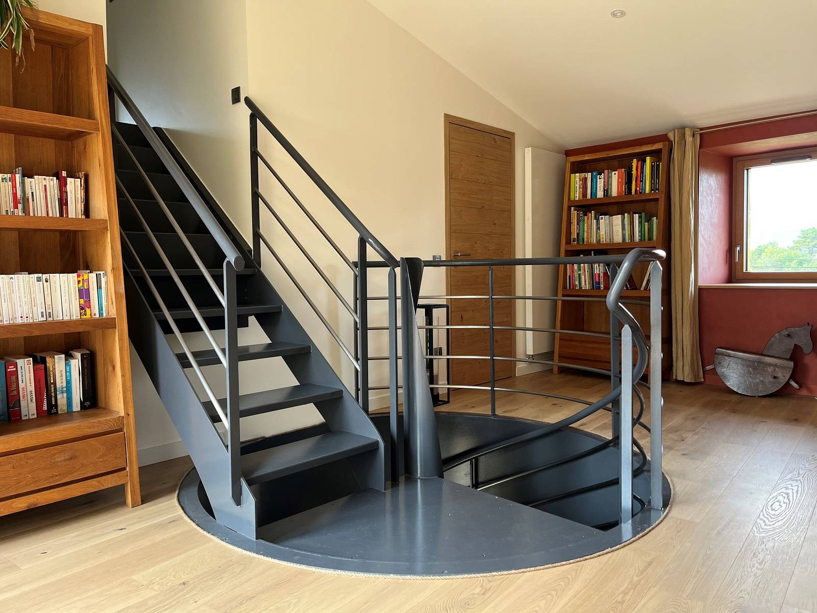 Le projet s’articule autour d’un escalier hélicoïdal au design contemporain, dont la structure en acier met en valeur la force et la légèreté du métal. Ses lignes épurées et son emmarchement généreux offrent une montée confortable, tout en dialoguant harmonieusement avec les volumes anciens de la bâtisse rénovée. L’escalier hélicoïdal est constitué de marches découpées et pliées en forme de « C », garantissant une rigidité optimale au niveau du nez et du talon. L’ensemble repose sur des platines en acier épais, renforcées par des goussets qui assurent une reprise solide des efforts au pied du tube central. Le palier d’arrivée du R+1 est entièrement caissonné afin d’offrir un appui rigide et durable, et de préparer le raccordement avec l’escalier droit. L’assemblage est intégralement réalisé par soudage sur site, ce qui garantit une homogénéité parfaite de la structure et une finition sans visserie apparente. La pose se fait sur massif béton.