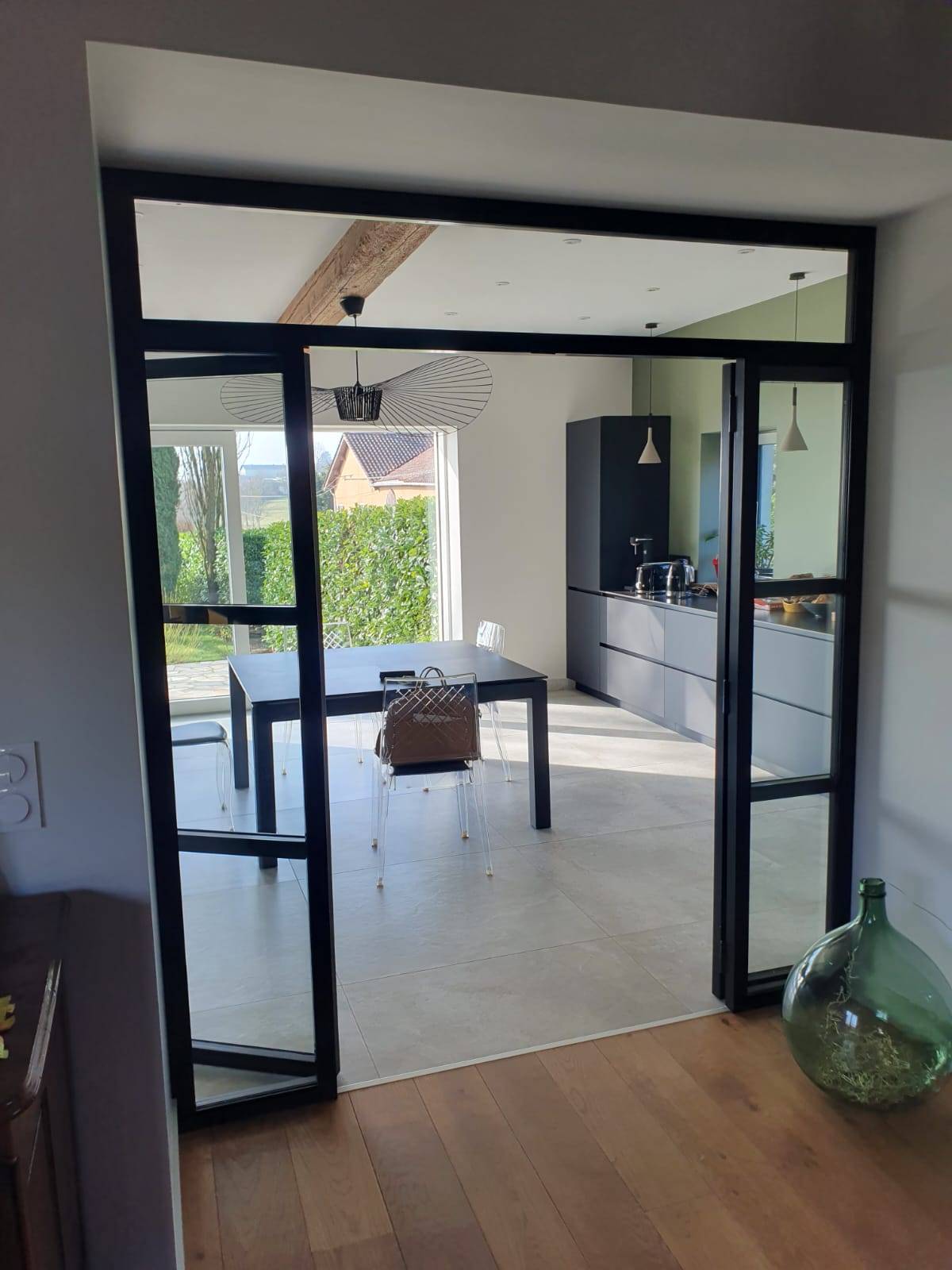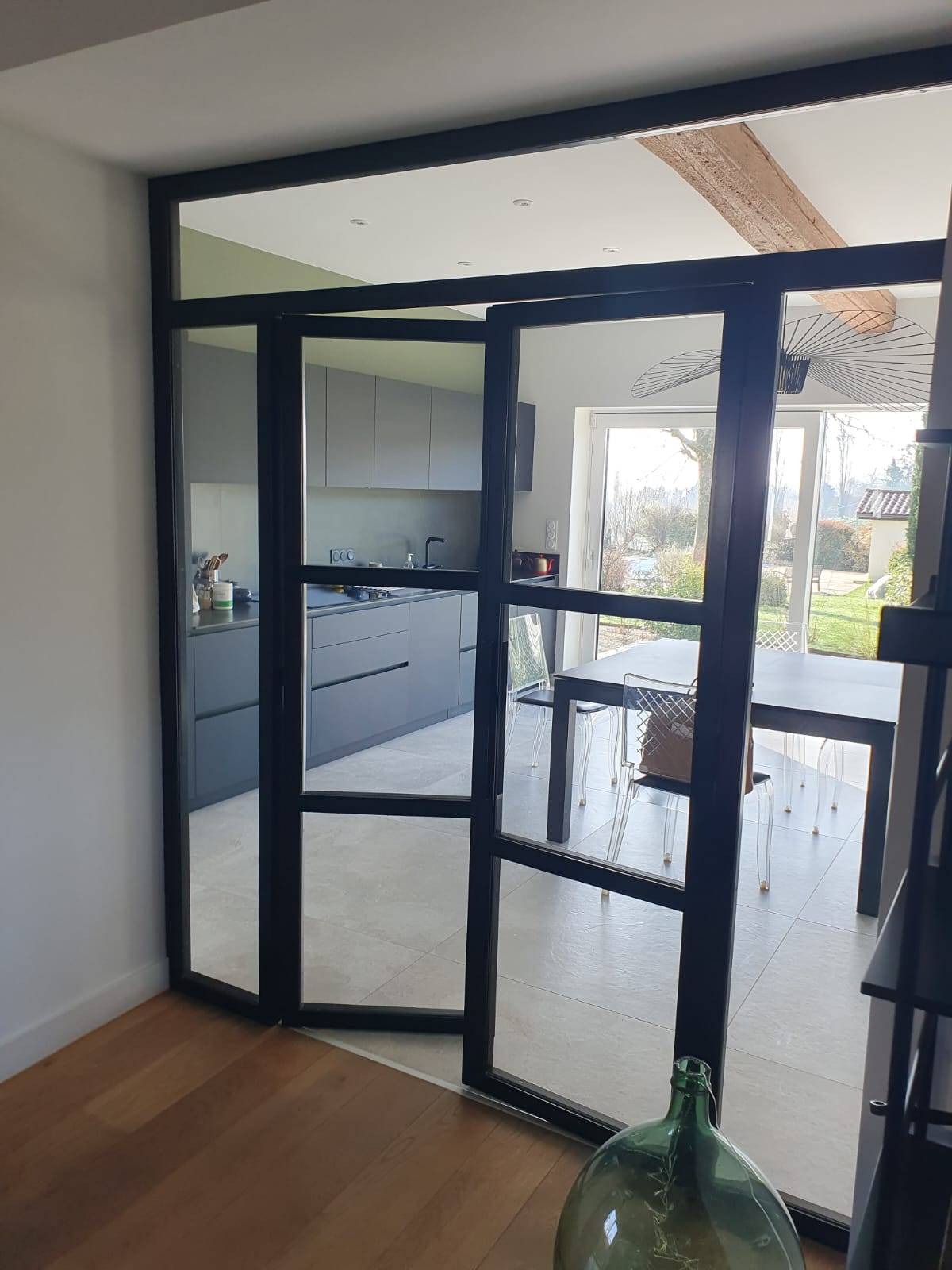 Pour structurer une cuisine ouverte tout en conservant la luminosité, ASMT DESIGN a réalisé une verrière intérieure acier et verre accompagnée d’une porte double vantaux sur mesure.