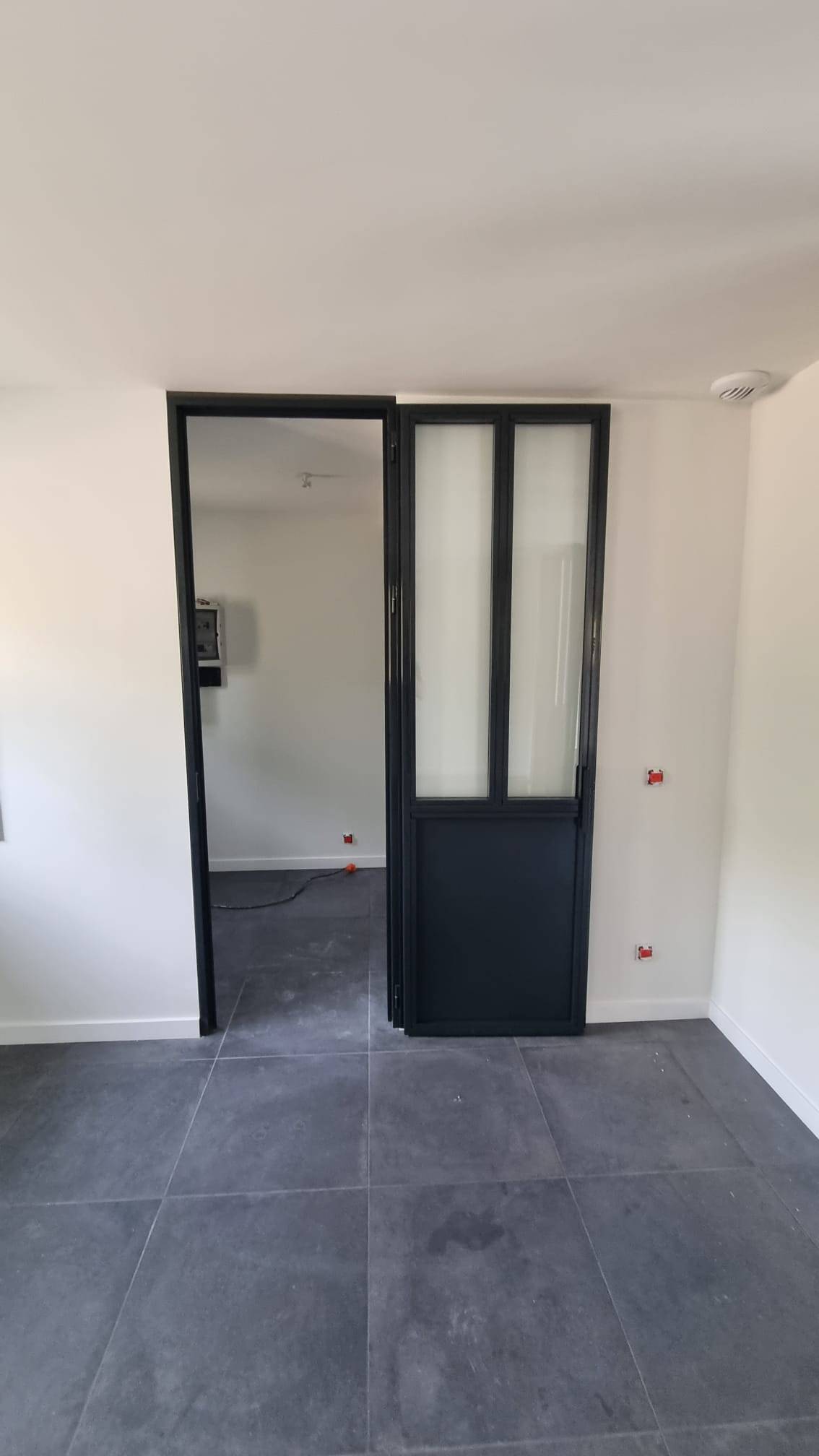 Un ouvrant avec 2 vantaux a été réalisé, sans seuil et avec une fermeture par serrure à rouleau et d’une poignée de tirage, avec un verrou à bascule . ASMT DESIGN a utilisé le même genre de verre que pour les châssis fixes.
