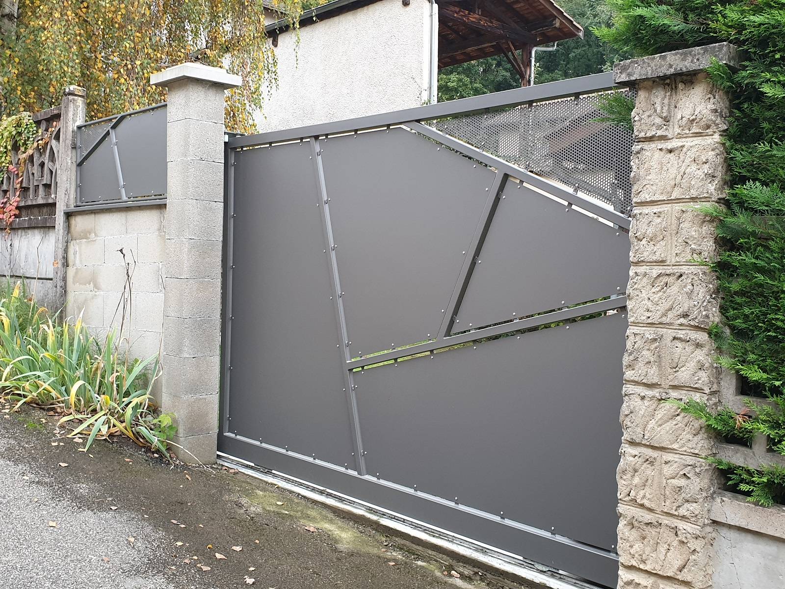 À Neuville-sur-Saône, ASMT Design a rénové l’entrée avec portail coulissant manuel et pare-vue acier perforé, alliant sécurité, fonctionnalité et esthétisme moderne.