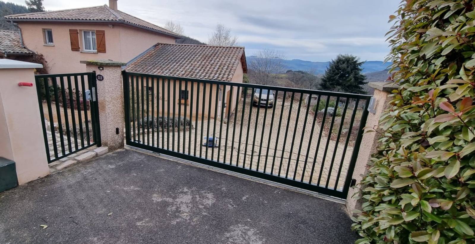 À Saint-Cyr-le-Châtoux, ASMT Design a installé portail coulissant motorisé, portillon et garde-corps galvanisés et thermolaqués, alliant sécurité, esthétique et fonctionnement optimal sur longrine béton existante.